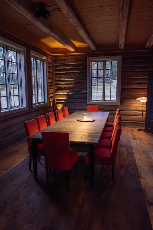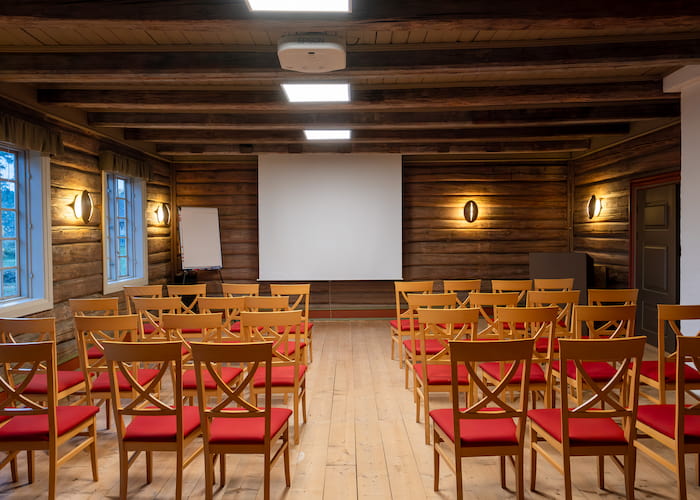 Konferanserom med plass til 20 stk, med koksovn og tømmervegger, rundt et ovalt bord.